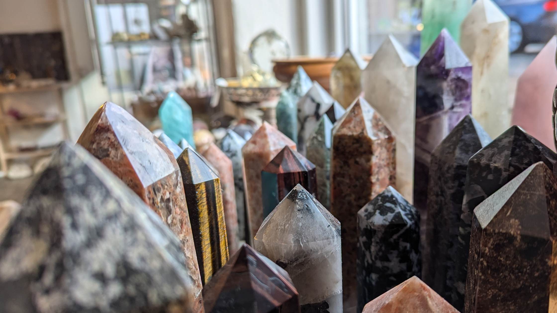 I butikken finder du krystaller og mineraler fra alle kontinenter.