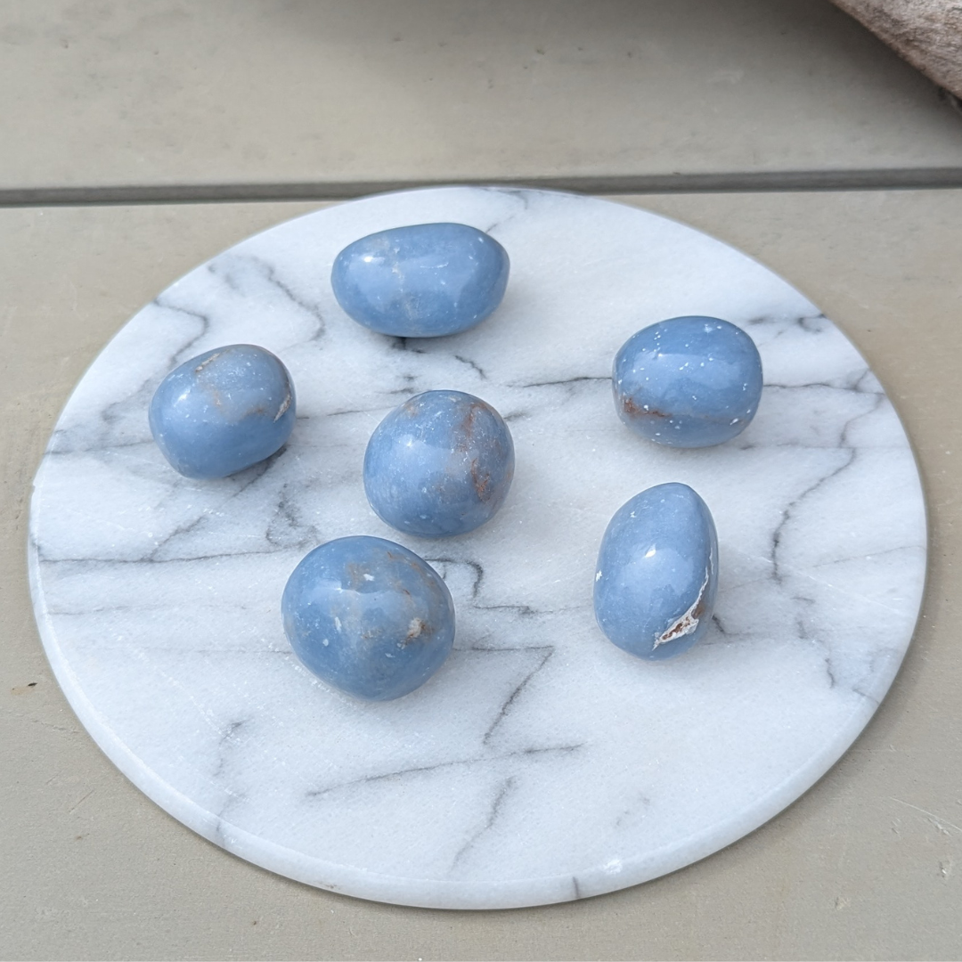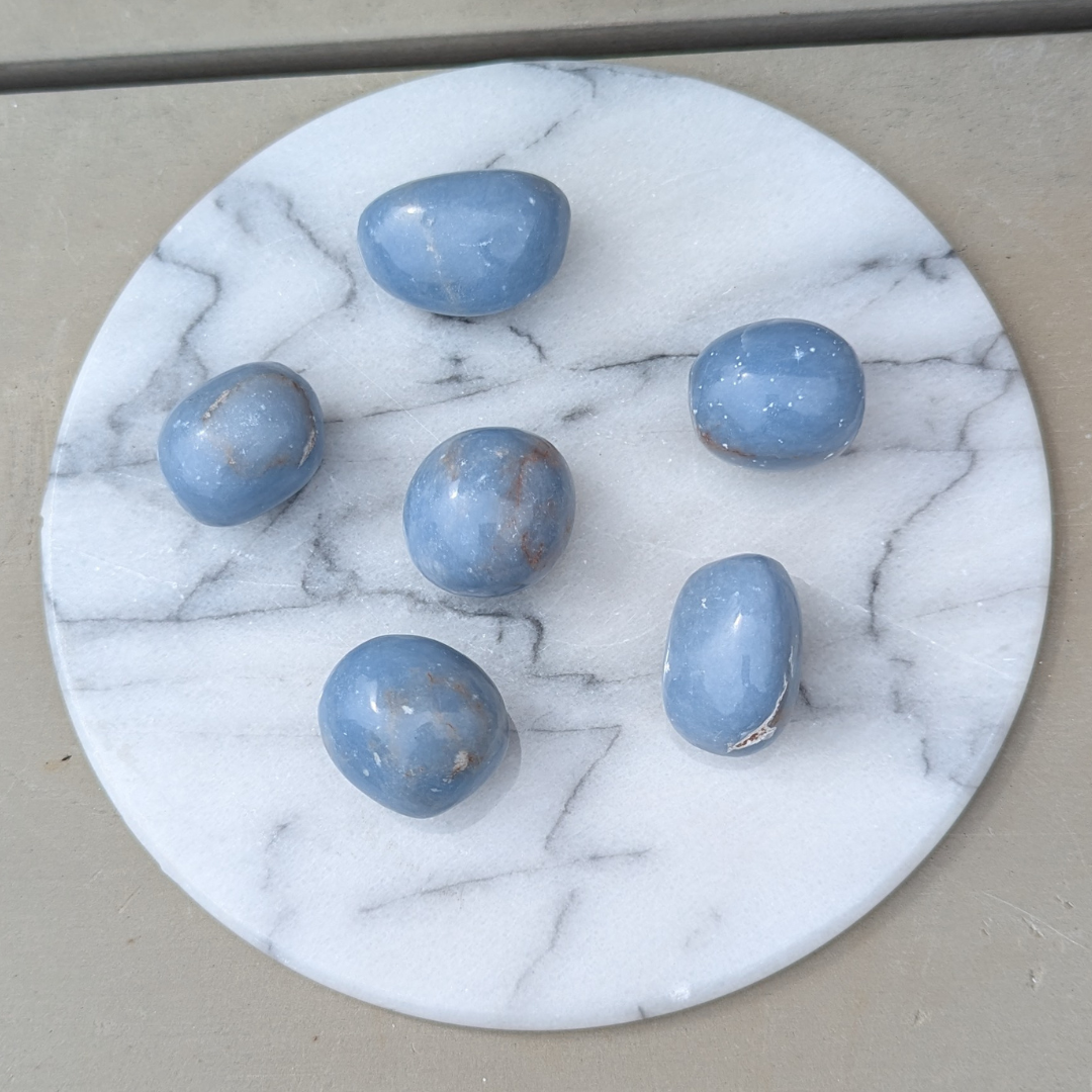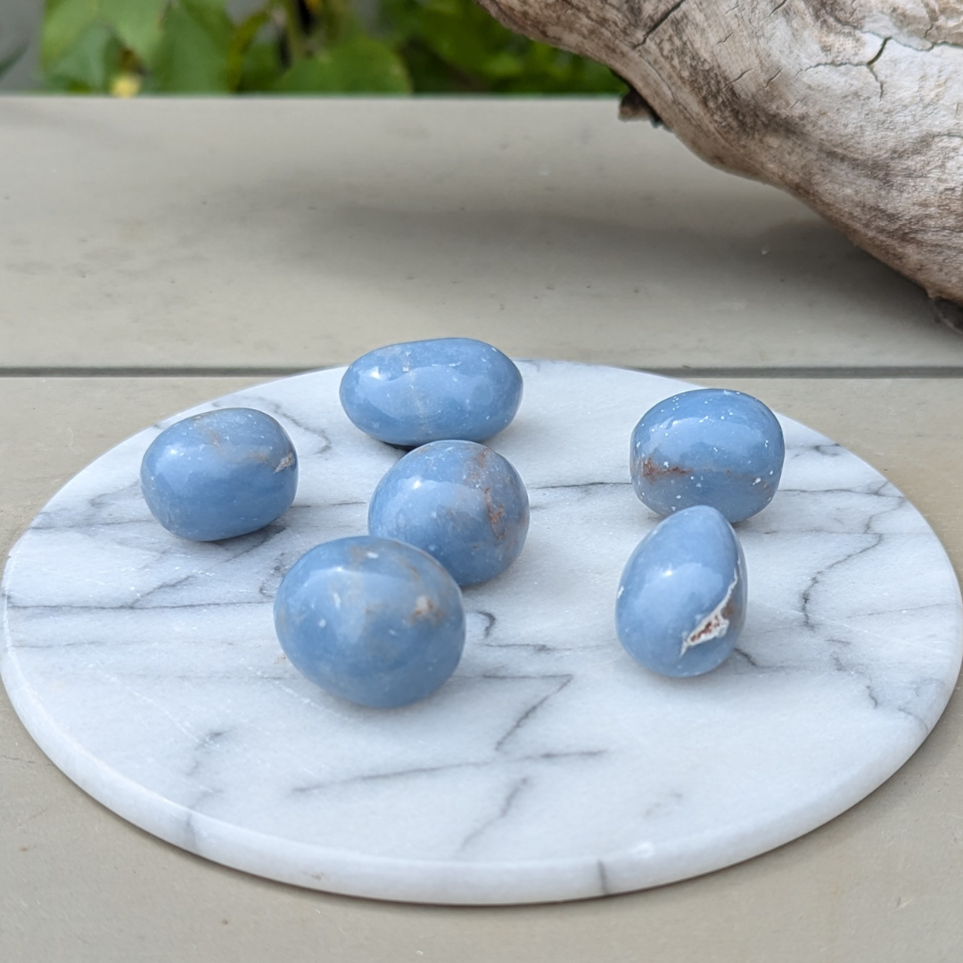Angelit kommer med fred og solidaritet. Som navnet hentyder, letter angelit kontakten til engle riget og dine guider, den forstærker telepatiske evner og styrker din kommunikation på alle niveauer. Angelit er en kraftfuld sten for healere, da den gør indlevelsesevnen dybere og forhøjer opfattelsesevnen. Den er fyldt med medfølelse og åbnerdin kanal for spirituel guidence og inspiration.