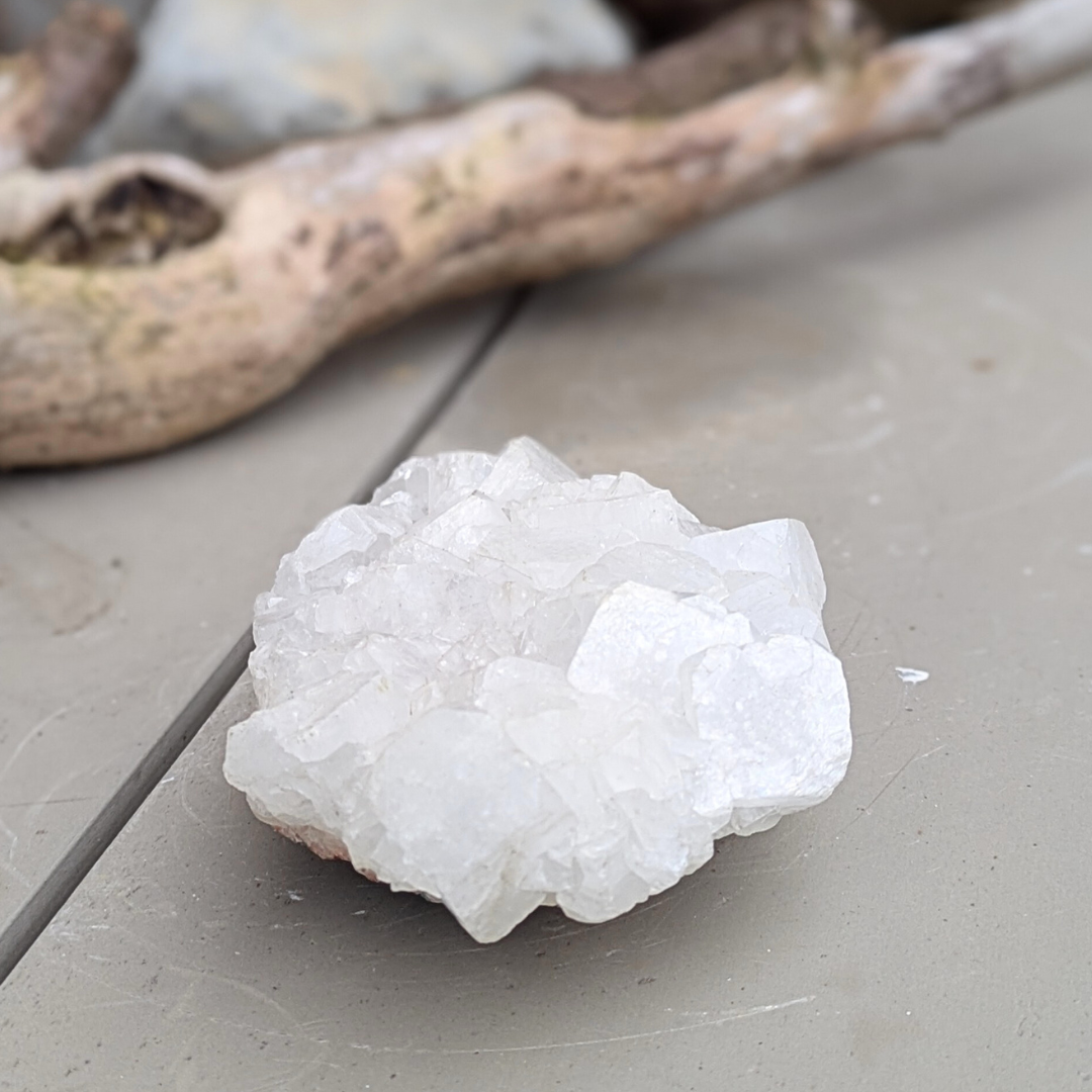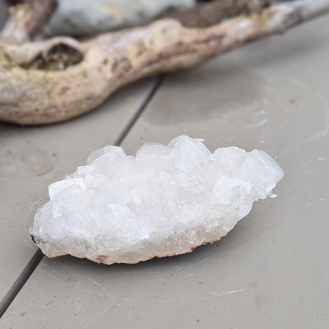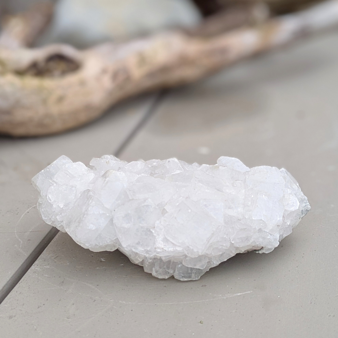 Det siges at: apophyllit har et højt indhold af vand og bevæger sig mellem fast og flydende materie i en meget høj vibration, det gør den eminent til arbejde med akasha arkiverne. Dens tilstedeværelse i et rum forstærker energierne. Apophyllit skaber en bevidst forbindelse mellem den fysiske og de spirituelle verdener. Under astral rejser holder den en stærk forbindelse med den fysiske krop og tillader informationer at blive transmitteret fra den åndelige verden ind i den fysiske. Den forstærker klarsyn og andre spirituelle evner. Den beroliger mentalt og derfor god hvis du mærker stress. Den frigør negative tanker og frygtbaseret adfærd, og giver derved plads til universel kærlighed og forbundethed. Selv om den har høj energi og trækker dig opad, så hjælper den dig til at føle dig godt tilpas i din krop.