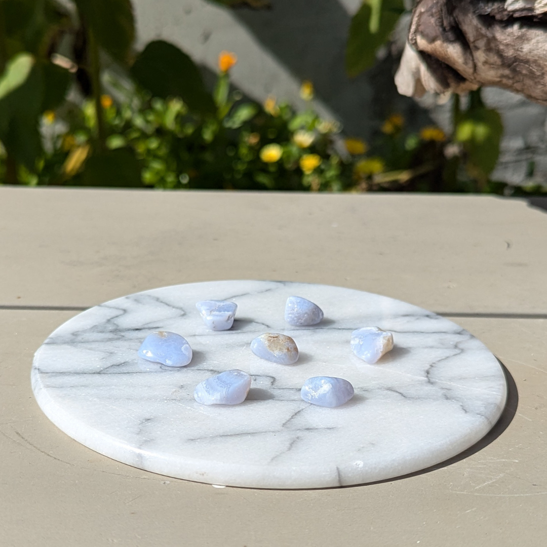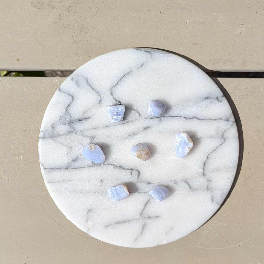 Den smukke blonde agat er kendetegnet ved sin flotte lyseblå farve med tynde linjer. Den er en god dæmper af angst, nervøsitet og et uroligt sind. Den er også godt ved et godt temperament. Den vil støtte dig i at tage det roligt og “flyde” med livets gang. Den er god til at lade dig give slip på alle bekymringer. Blondeagat er godt til meditation især hvis du har brug for at give slip på noget.