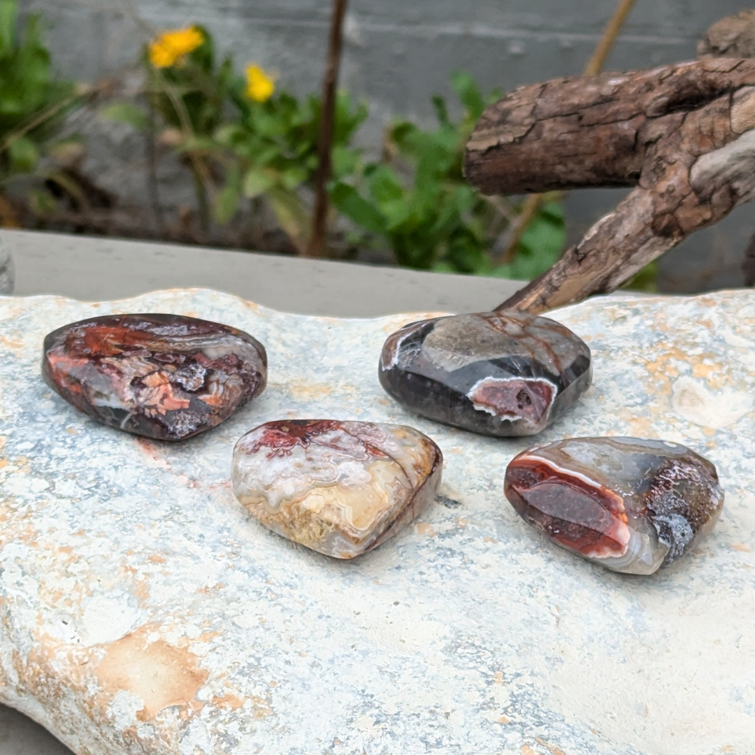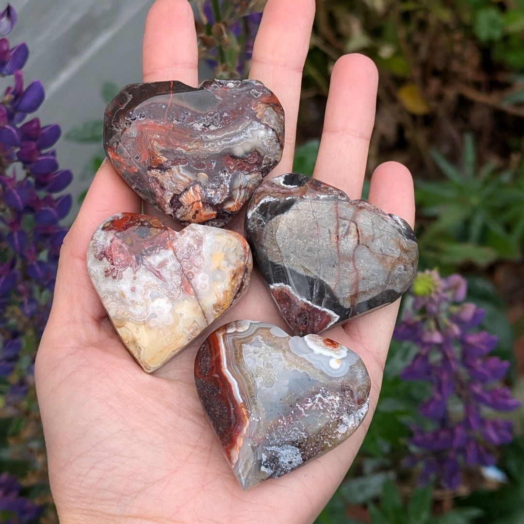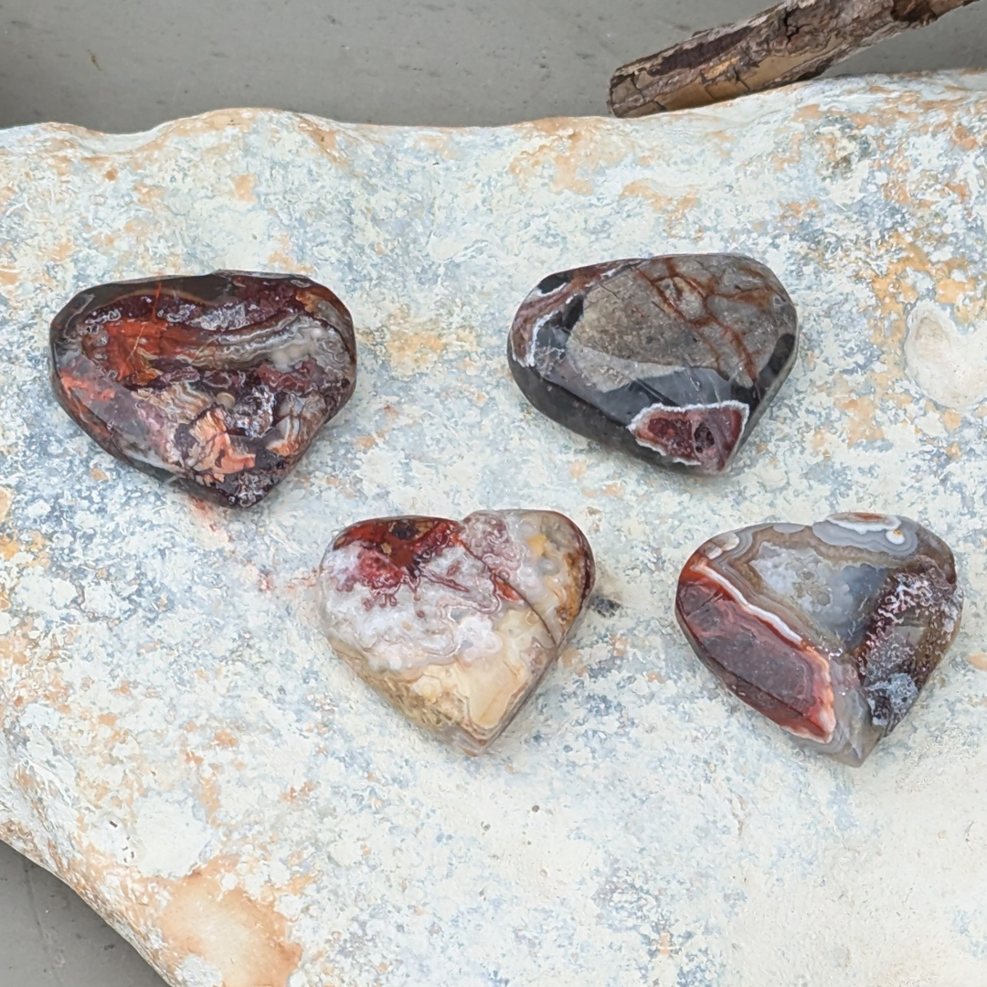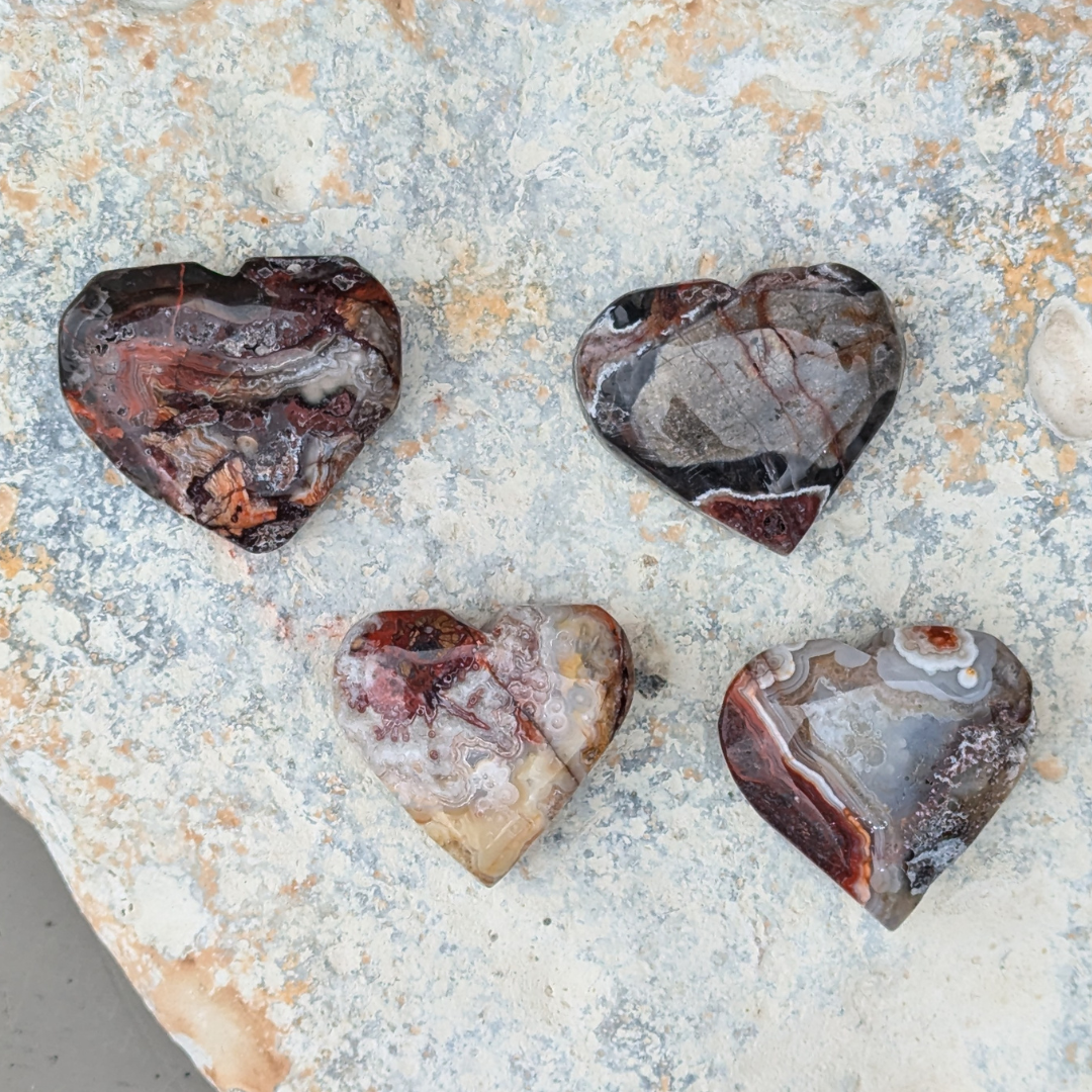 Crazy lace agat har farverne klar, hvid, rødlig, brunlig og grå med meget fine mønstre der snørkler sig rundt. De lyseste af dem bære en feminin energi, hvorimod de rødlige har en mere maskulin energi. Den er en sten der vil lade dine følelser træde frem og aktivere din selvaccept. Den beroliger dig og lader dig vide at det er Ok at give slip og flyde med det der sker. Du vil føle dig fri og afslappet med en lace agat i lommen.