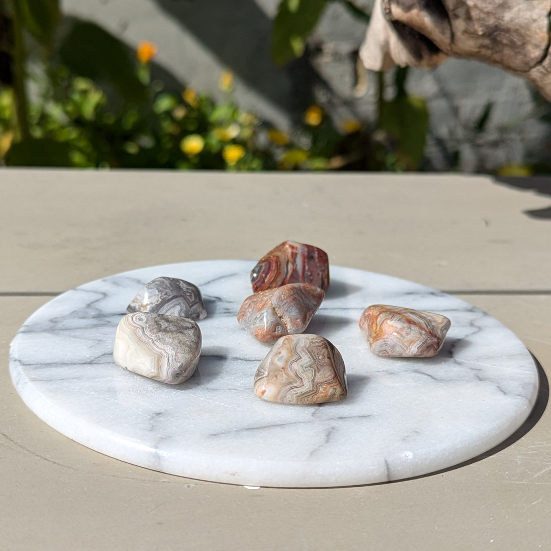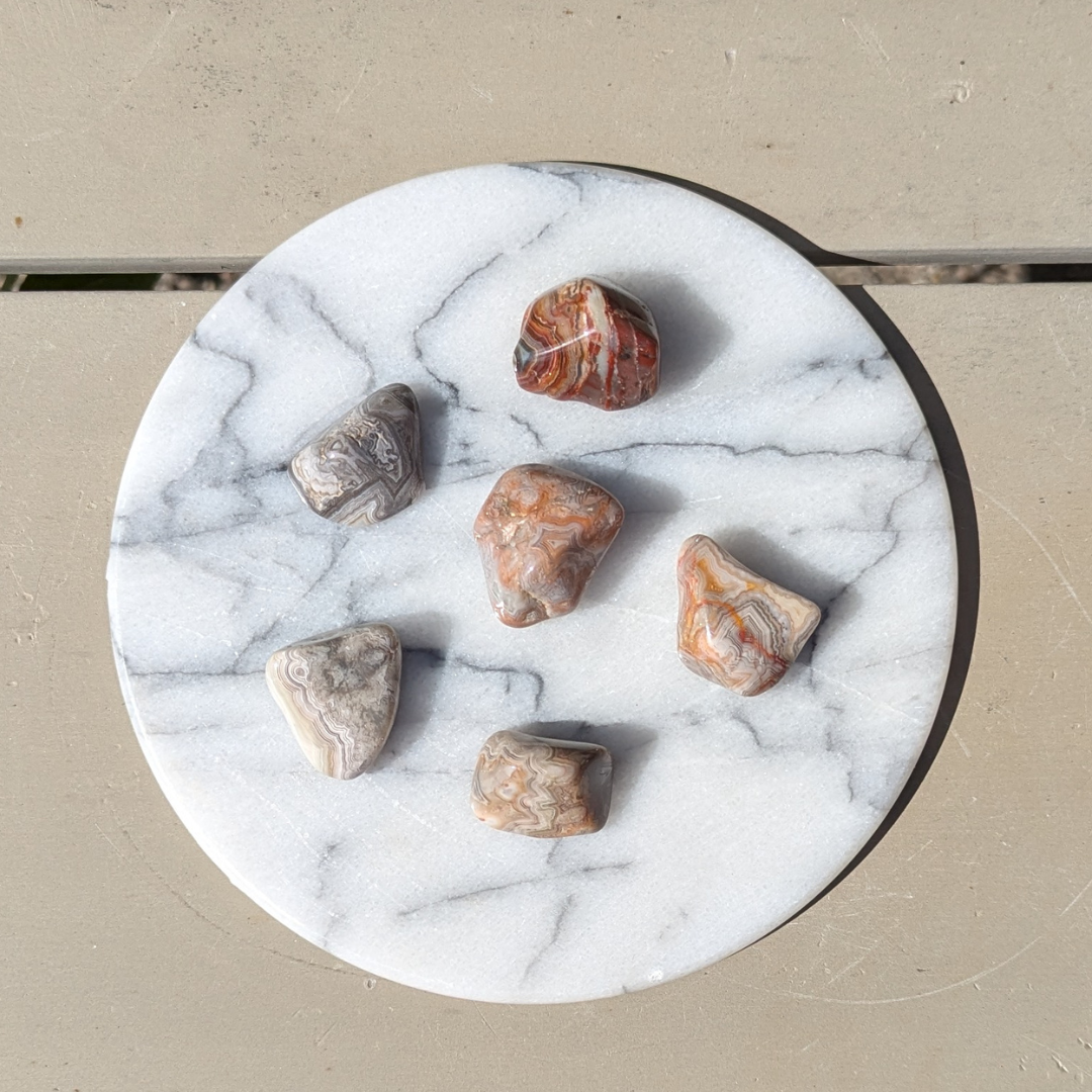 Crazy lace agat har farverne klar, hvid, rødlig, brunlig og grå med meget fine mønstre der snørkler sig rundt. De lyseste af dem bære en feminin energi, hvorimod de rødlige har en mere maskulin energi. Den er en sten der vil lade dine følelser træde frem og aktivere din selvaccept. Den beroliger dig og lader dig vide at det er Ok at give slip og flyde med det der sker. Du vil føle dig fri og afslappet med en lace agat i lommen.