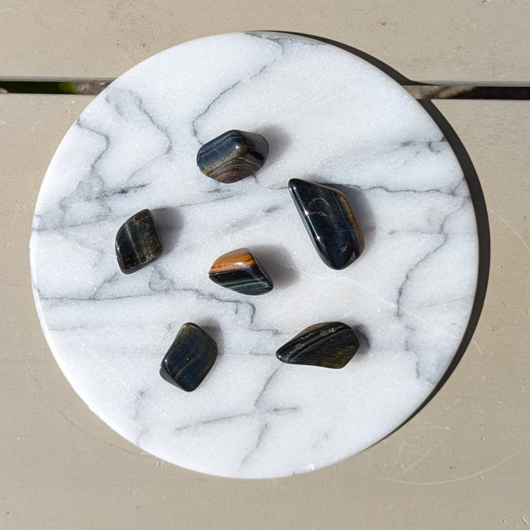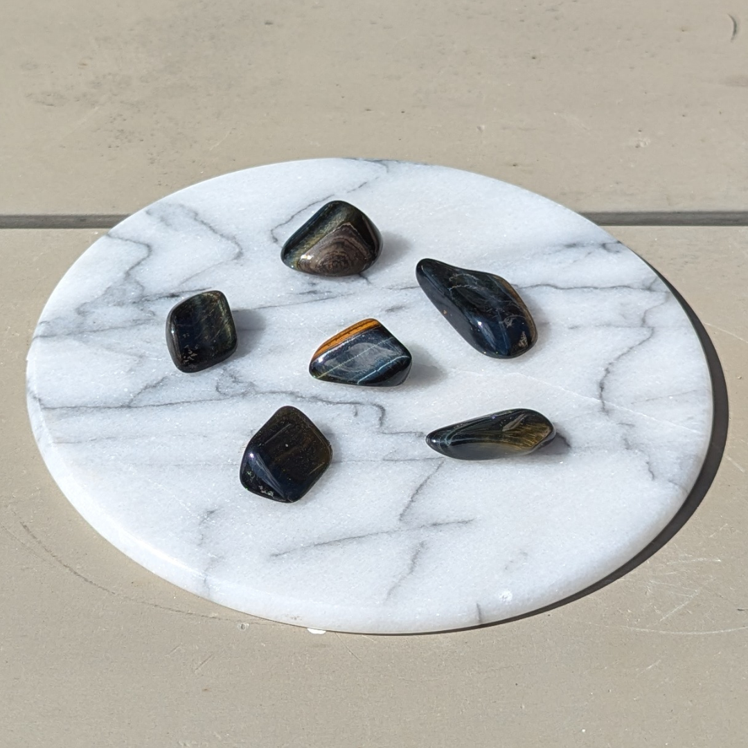Falkeøje har en smuk dyb blå-sort eller blågrøn farve. Man ser tydeligt farverne når man vipper den i solen. Falkeøje har som navnet siger en kobling til falkens skrabe blik. Den giver overblik og hjælper os med at se tingene fra oven. Vi kan se på en situation med andre øjne og derved distancere os fra problemerne. Vi kan se dybt i os selv. Den er en god støtte ved situationer, der kræver ændring. Den hjælper os med at overskue problemerne, overvinde hindringerne, opløse begrænsningerne og kaste os ud i livet- ud i det ukendte.