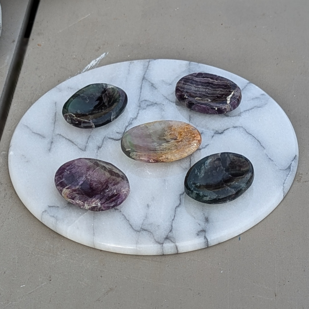 Fluorit stabilisere og renser auraen. Den er rigtig god ved elektromagnetisk stress med placering ved fx en computer. Når fluorit benyttes ved healing trækker den alle negative energier væk.