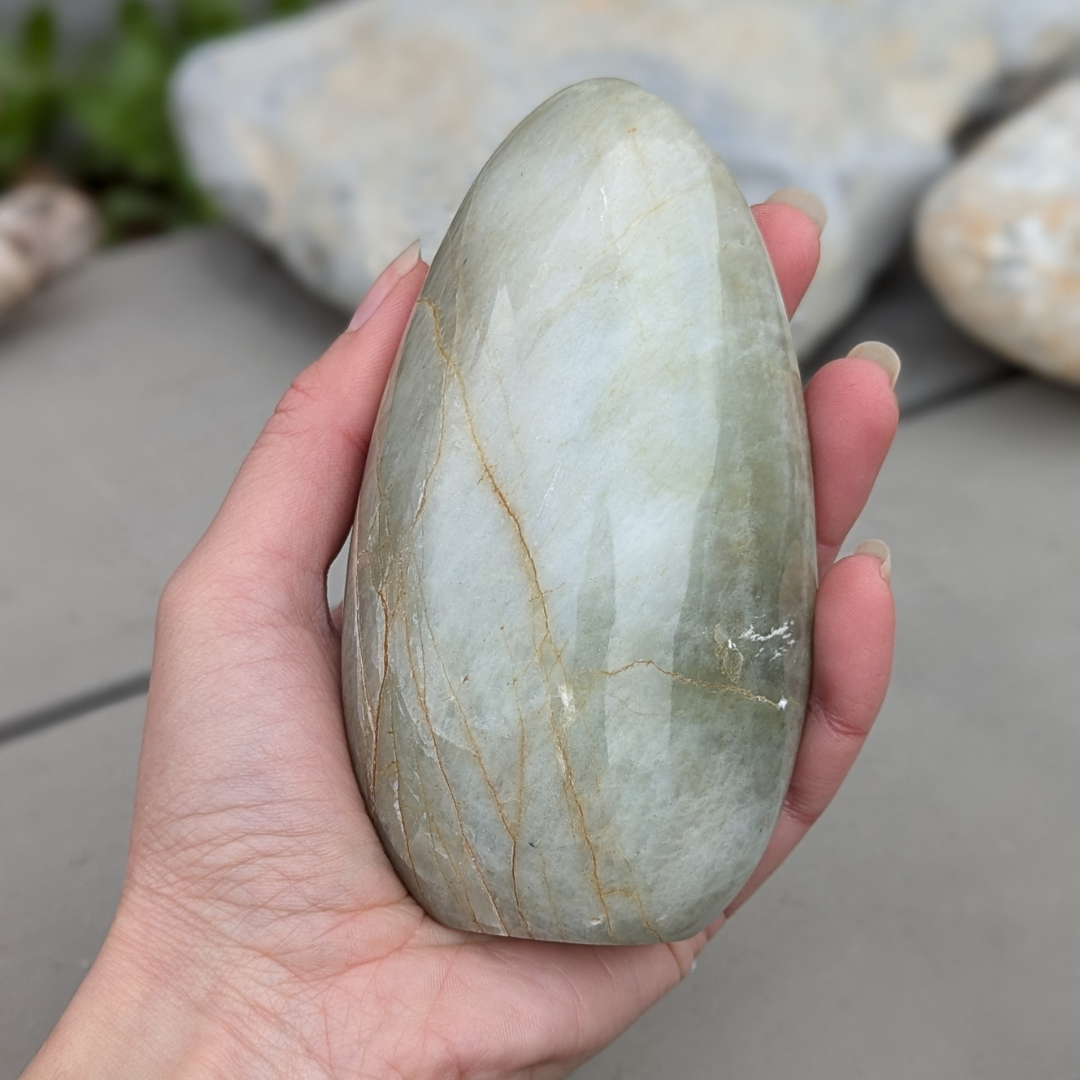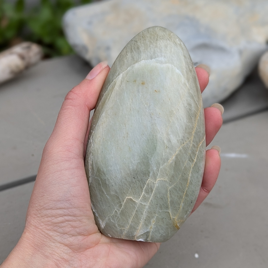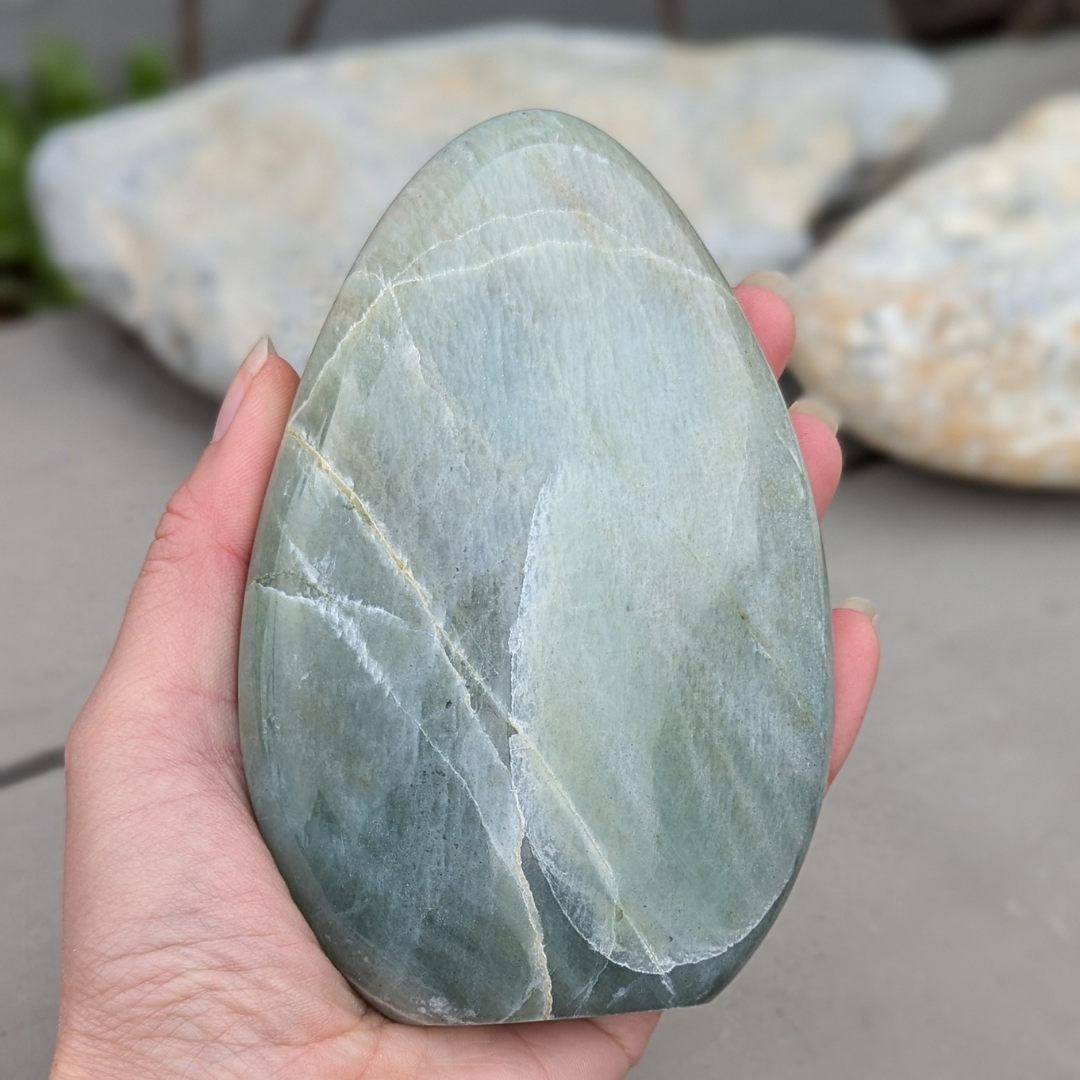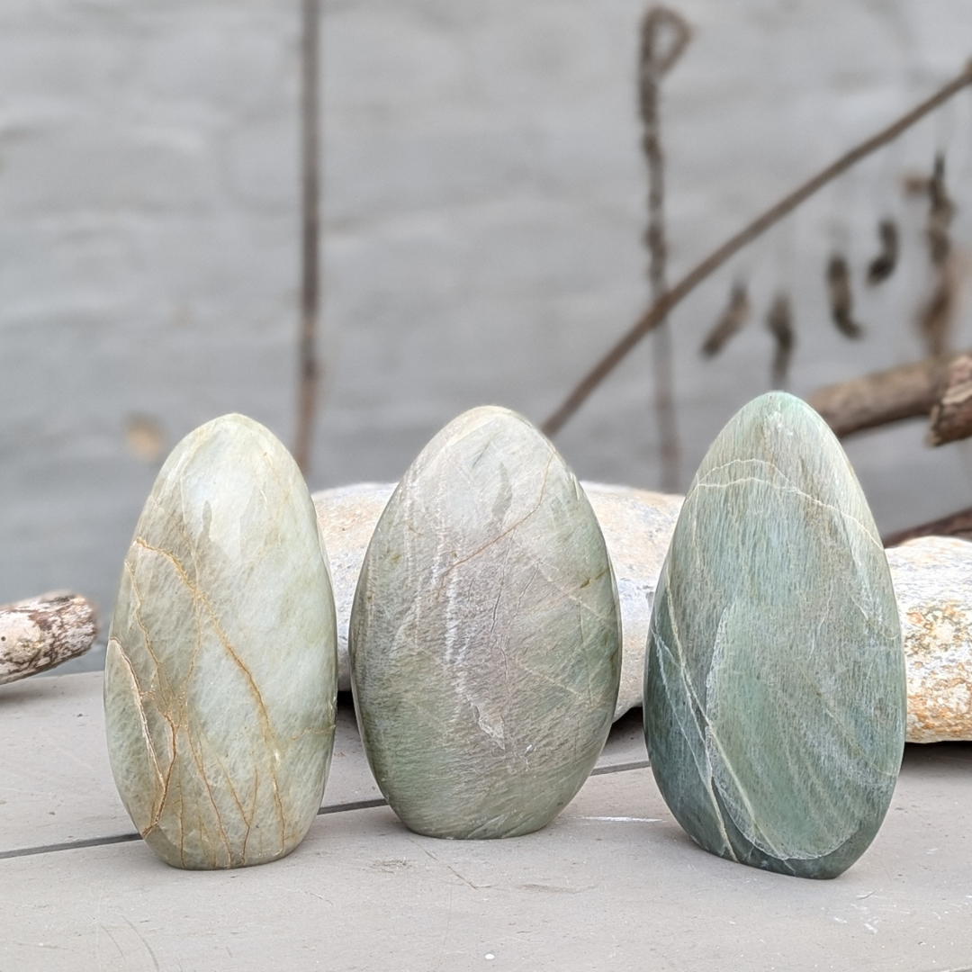 Grøn månesten har en lidt anderledes energi end de andre månesten du måske kender. Den renser hjerte chakraet for negative følelser, ophobet vrede, jalousi, generelt negative narrativer vi i perioder opbygger om os selv når vi føler os sårede, utilstrækkelige, især i forhold til vores partner. Den er være særligt god ved følelsen af svigt. Grøn månesten viser os at kærligheden altid er stærk, og aldrig vil svigte os. Vi kan arbejde os igennem vores udfordringer. Den lader os se på vores egen rolle i situationen og hjælper os med at få ryddet op så vi atter kan gøre plads til fred og accept. Grøn månesten hjælper og med at tage lidt letter på tilværelsen og giver os et postivet og humoristisk livssyn.