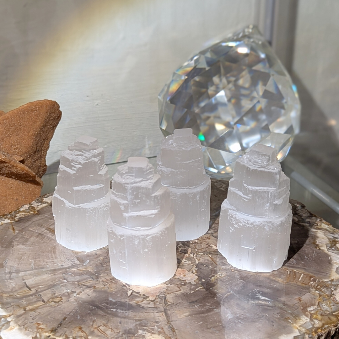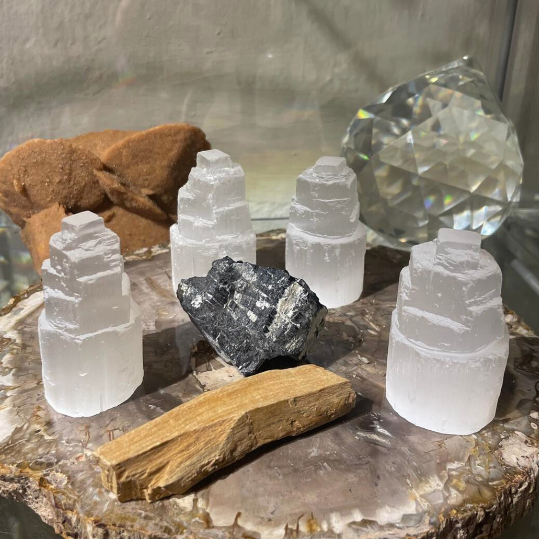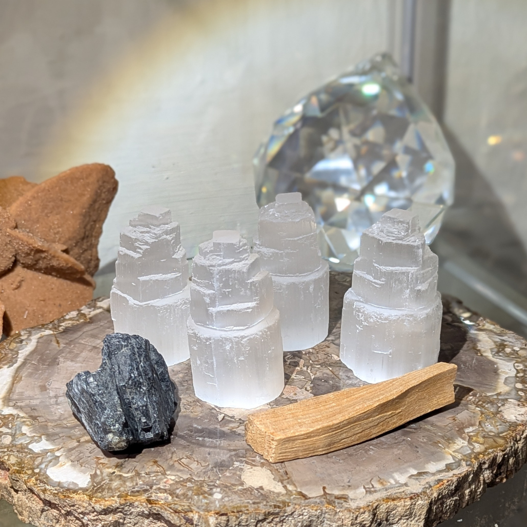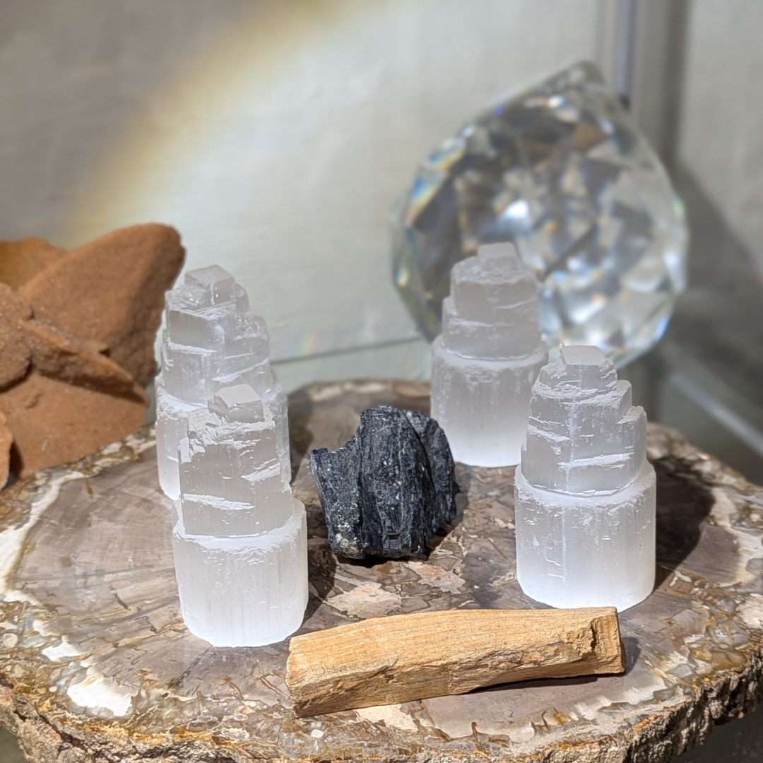 Sættet består af 4* selenit tårne, 1 stykke sort turmalin og en palo Santo.