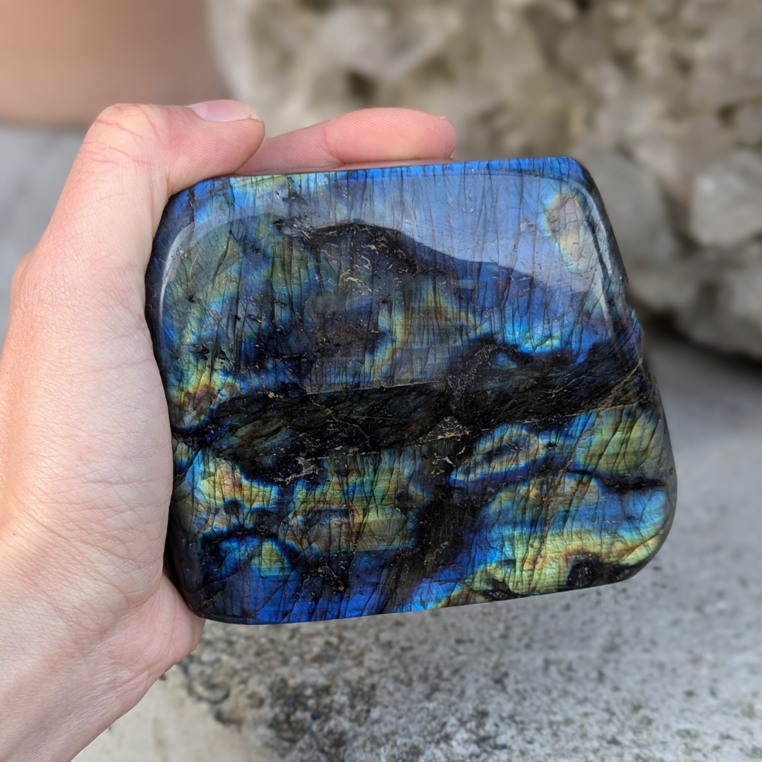 Labradorit er en fantastisk smuk sten. Så mystisk og foranderlig- helt mørk men med lysets stråler forvandler den sig til et hav af farver. Øjet fascineres og går på opdagelse efter farverne.