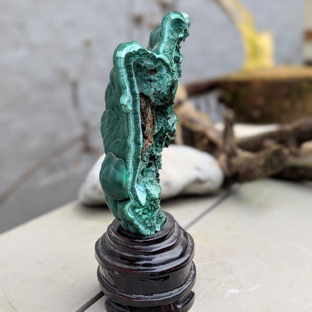 Det siges at: Malakit er en kraftfuld sten, den forstærker både positive og negative energier. Det er en transformations sten, den prikker til din eventyrlyst og lysten til forandring, og hjælper dig i det kaos der kan opstå inden og under store forandringer. Den viser nådesløst hvad der blokerer for din spirituelle udvikling. Den kan trække dybe følelser og psykosomatiske årsager frem, bryder uønskede bånd og forældede mønstre. Det er en sten der udvikler empati, fjerner generthed og støtter venskab. Den styrker evnen til at tilegne, behandle og holde på nye informationer og indsigter. Anbragt på solarplexus muliggør malakit dyb følelsesmæssig healing, den frigiver traumer, bringer undertrykte følelser frem og genopretter evnen til at trække vejret dybt. Den kan gøre stemninger mere intense, og malakit skal nogle gange bruges med en mere groundende sten, for at holde balancen