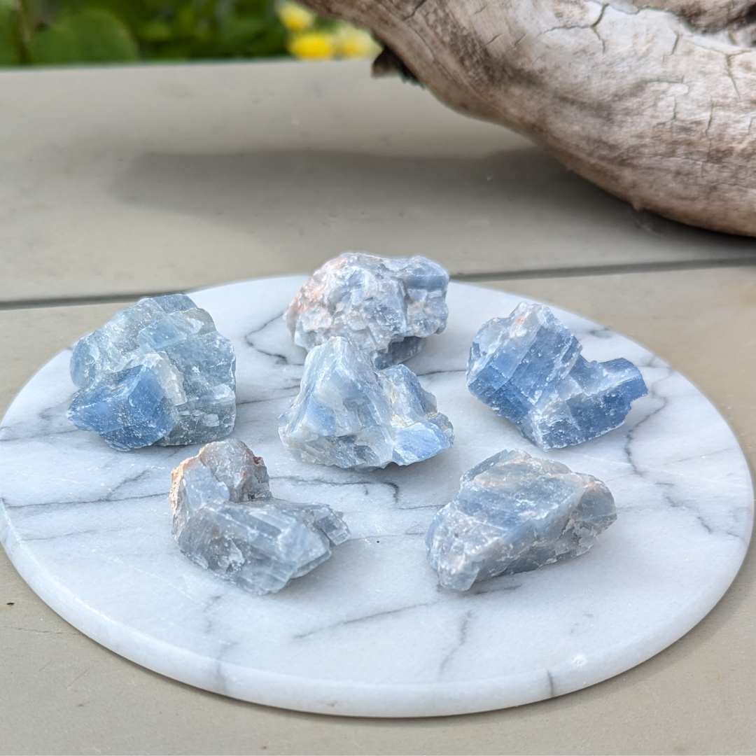 Blå calcit er en blid sten som er god til restitution og afslapning. Den er god ved smerter og dulmer nerverne samt frigør negative følelser. Den blå calcit hjælper dig til klar kommunikation, især hvis der er uenighed. Calcit virker kraftigt forstærkende og rensende på energier. Ved fx at have et stykke calcit i rummet, kan det rense for negative energier i omgivelserne og forhøje din energi. Calcit er en spirituel sten og er til god støtte ved spirituel udvikling. Calcit er god hvis du har mistet håbet eller din motivation. Den er god til dovenskab og hjælper dig med at blive mere energisk på alle niveauer. Mentalt beroliger calcit sindet, fremmer din dømmekraft og styrker din evne til at analysere det du befinder dig i. Den lindre følelsesmæssigt stress og giver dig ro istedet.