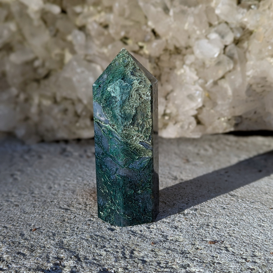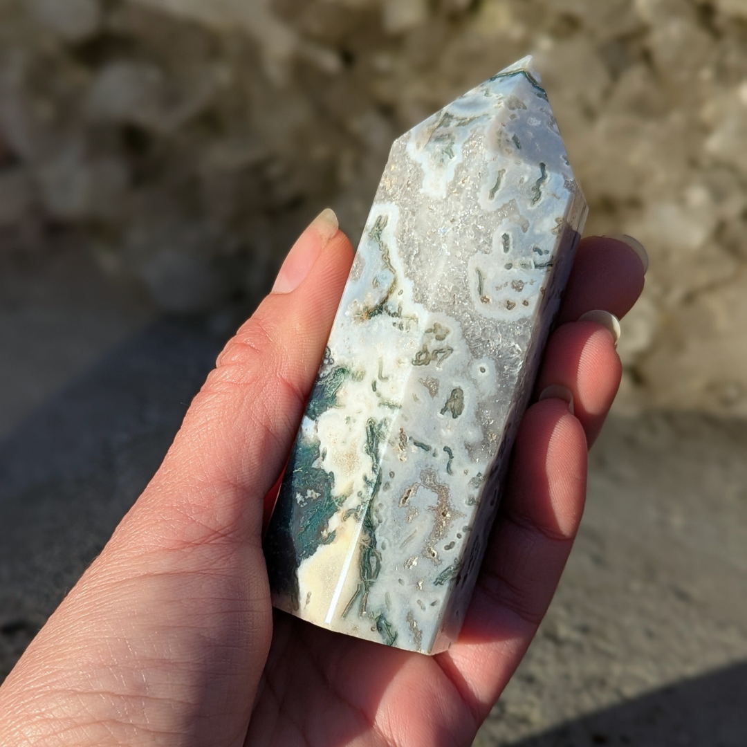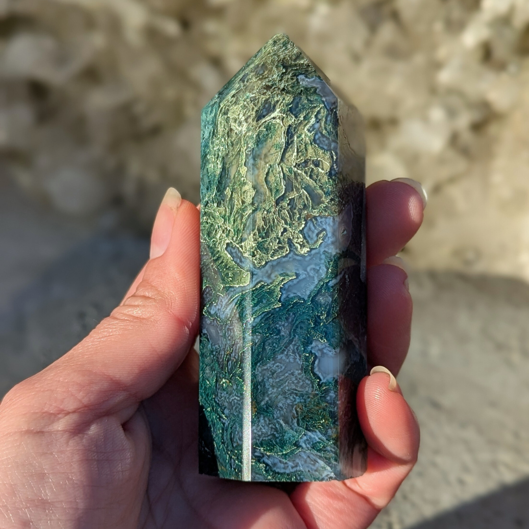 Det siges at: Mosagat healer hjertet, giver mod og hjælper dig med at få en god jordforbindelse. Mosagat er en god hjælp i alle situationer, hvor du har brug for at mobilisere al din viljestyrke, eller i perioder i dit liv, hvor du har brug for ekstra overskud – den vil fremme din vitalitet. Det er en stabiliserende sten der forbinder dig til naturen, alt liv omkring dig og minder os om at se skønheden i alt. Den arbejder på at frigøre blokeringer og mentale lænker. Mosagat er en velstands sten, der tiltrækker overflod, ikke bare økonomisk, men vil støtte alle former for frugtbar vækst og nye begyndelser. Den afbalancerer følelserne til gavn for vores kommunikation og din udtryksevne.