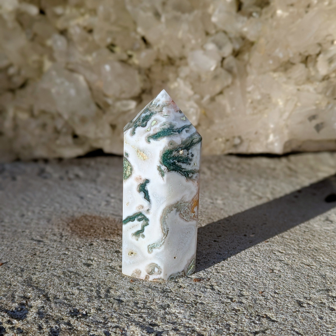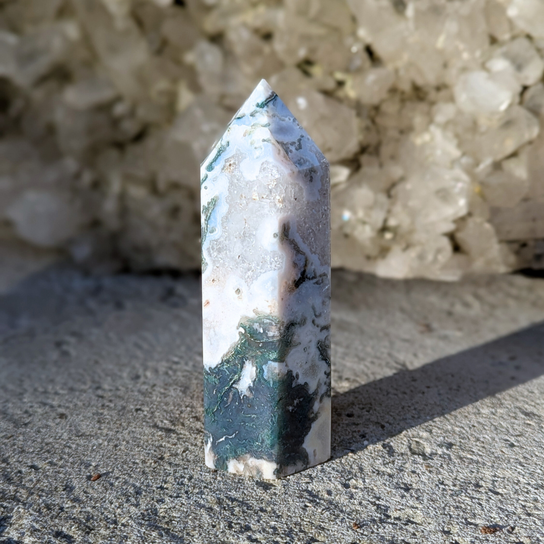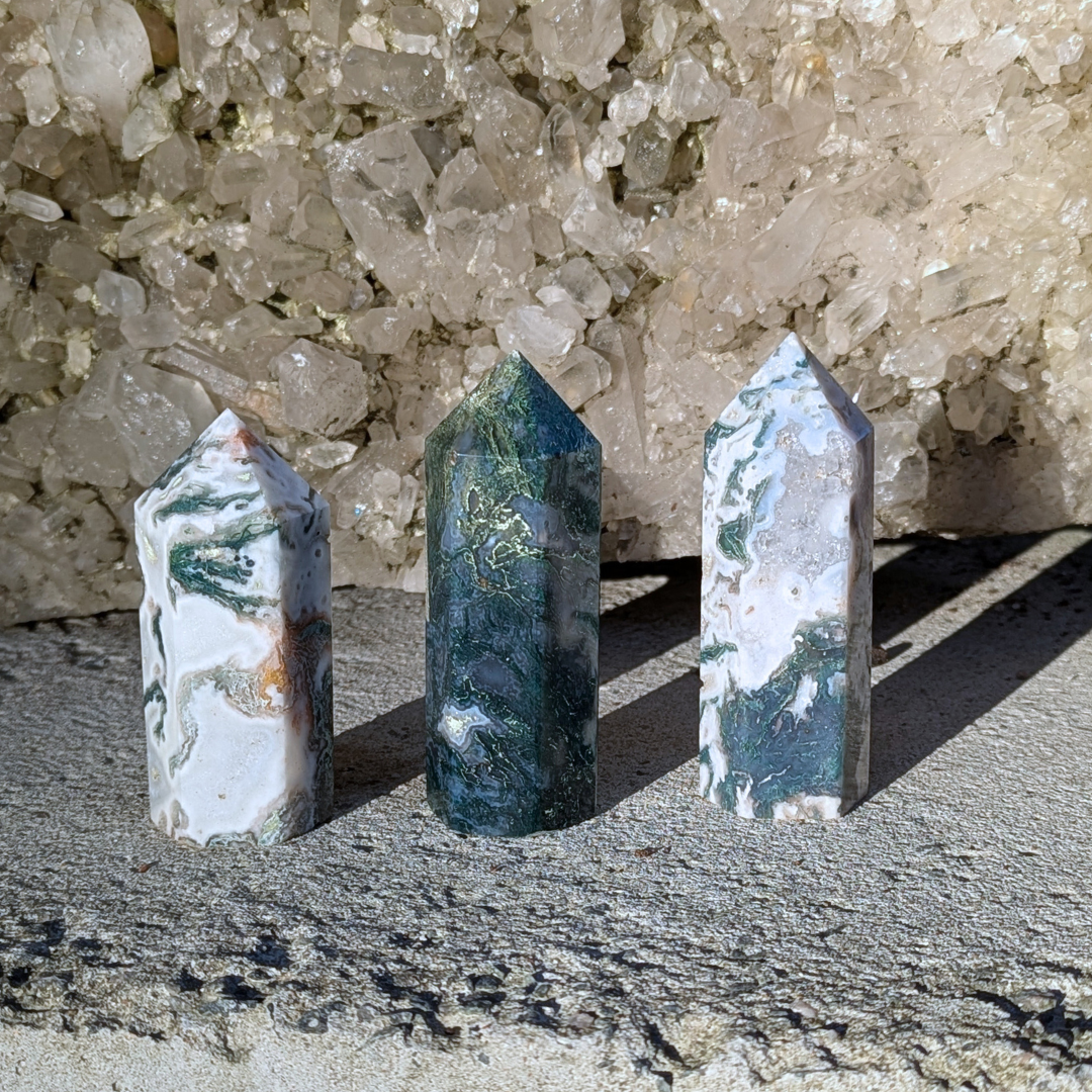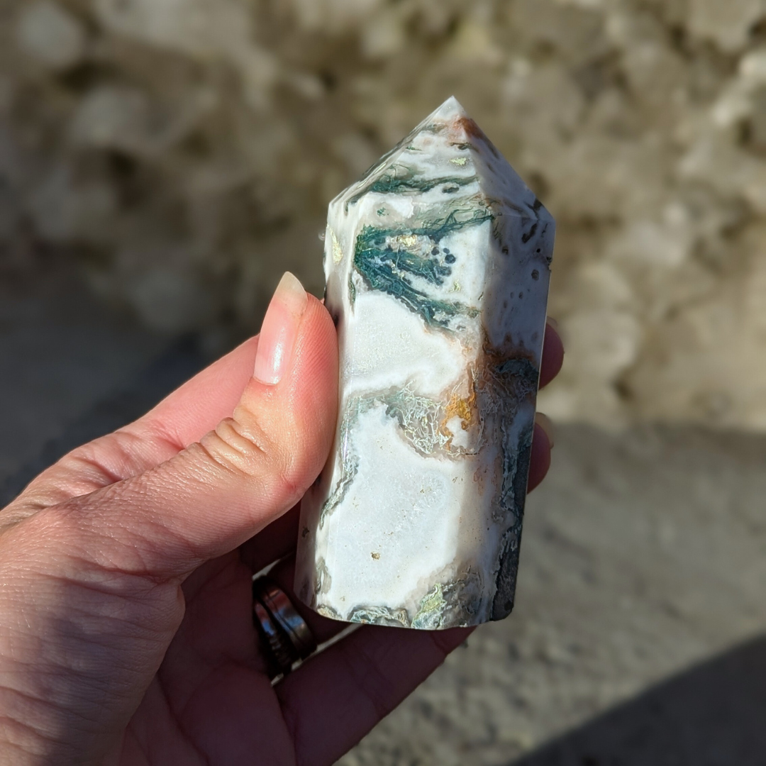 Det siges at: Mosagat healer hjertet, giver mod og hjælper dig med at få en god jordforbindelse. Mosagat er en god hjælp i alle situationer, hvor du har brug for at mobilisere al din viljestyrke, eller i perioder i dit liv, hvor du har brug for ekstra overskud – den vil fremme din vitalitet. Det er en stabiliserende sten der forbinder dig til naturen, alt liv omkring dig og minder os om at se skønheden i alt. Den arbejder på at frigøre blokeringer og mentale lænker. Mosagat er en velstands sten, der tiltrækker overflod, ikke bare økonomisk, men vil støtte alle former for frugtbar vækst og nye begyndelser. Den afbalancerer følelserne til gavn for vores kommunikation og din udtryksevne.