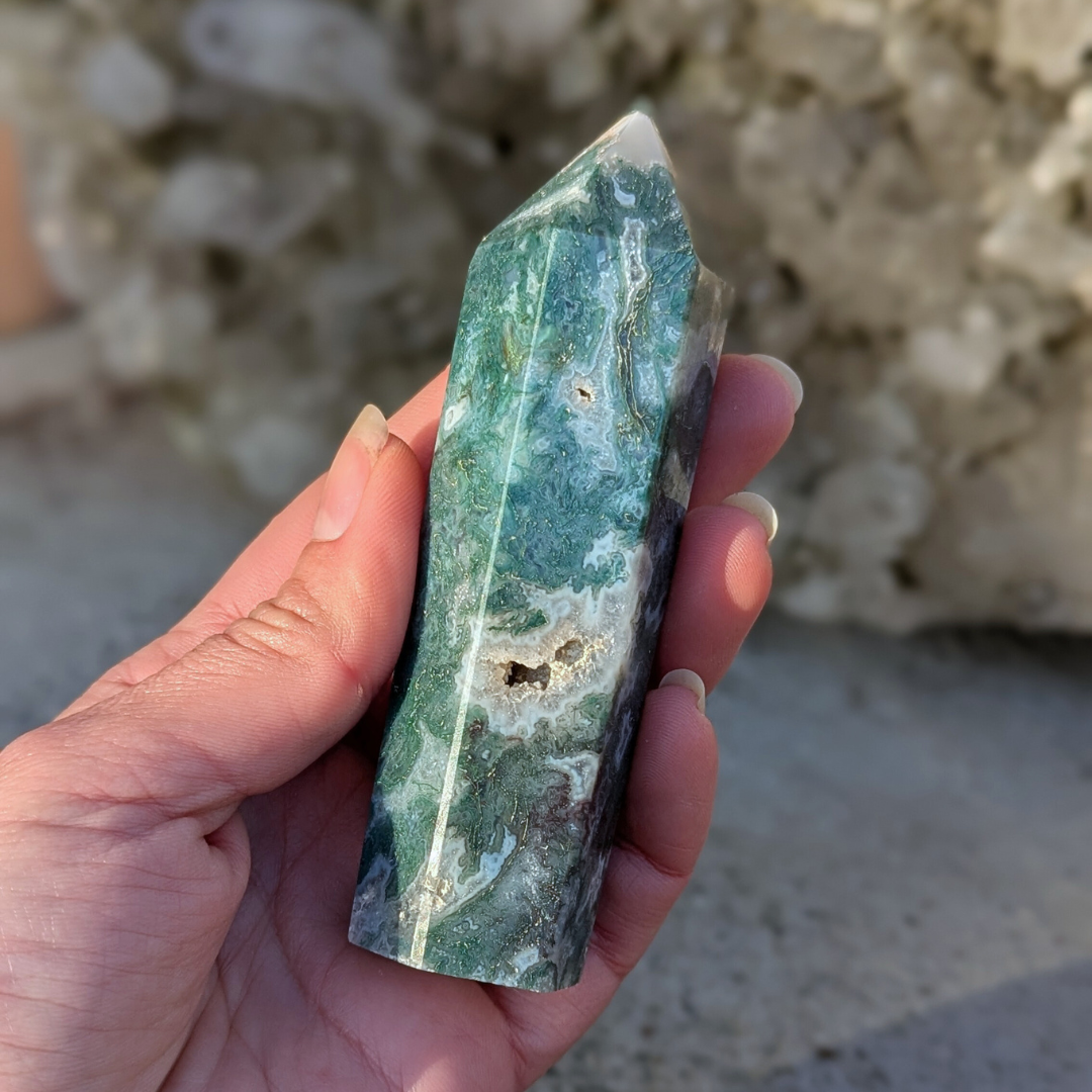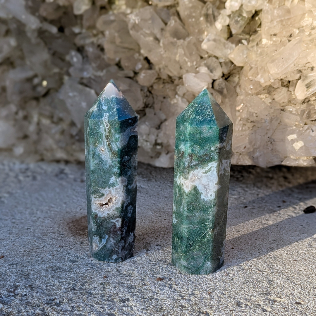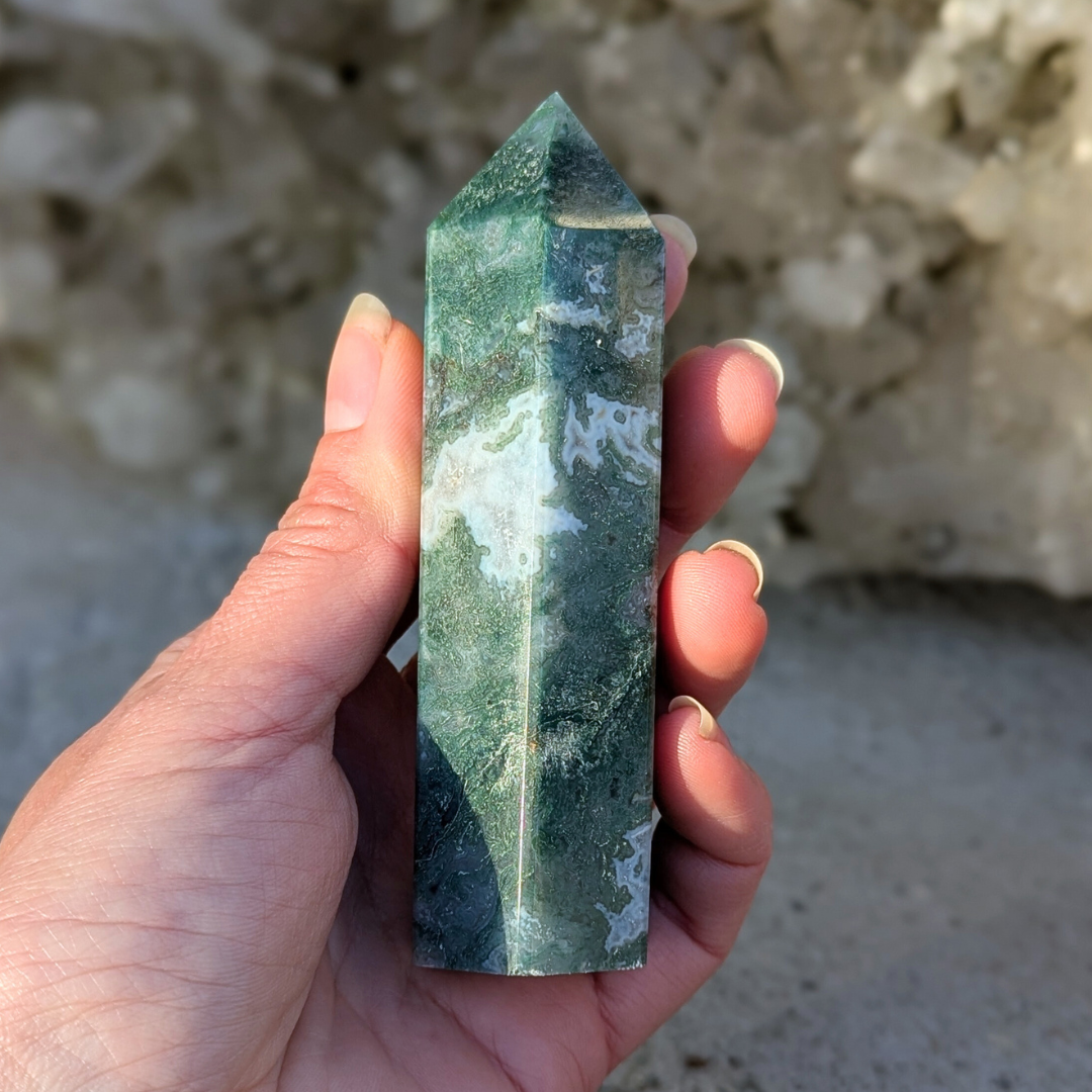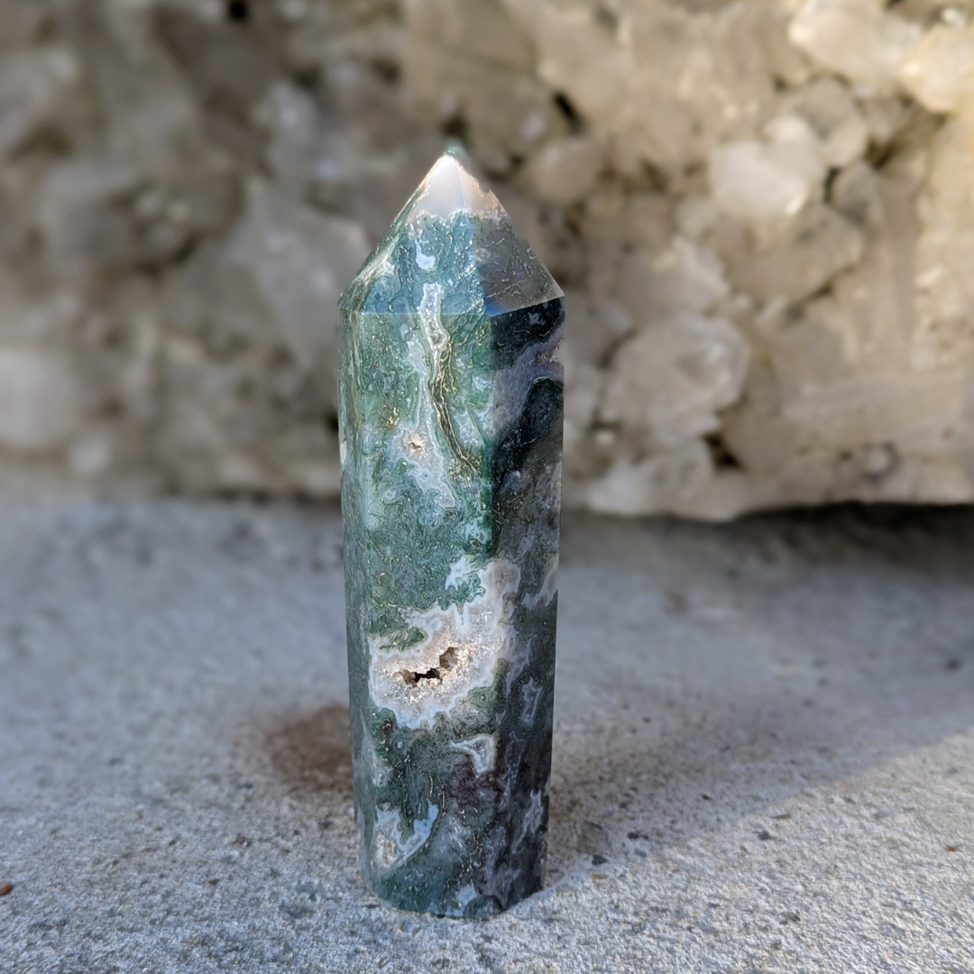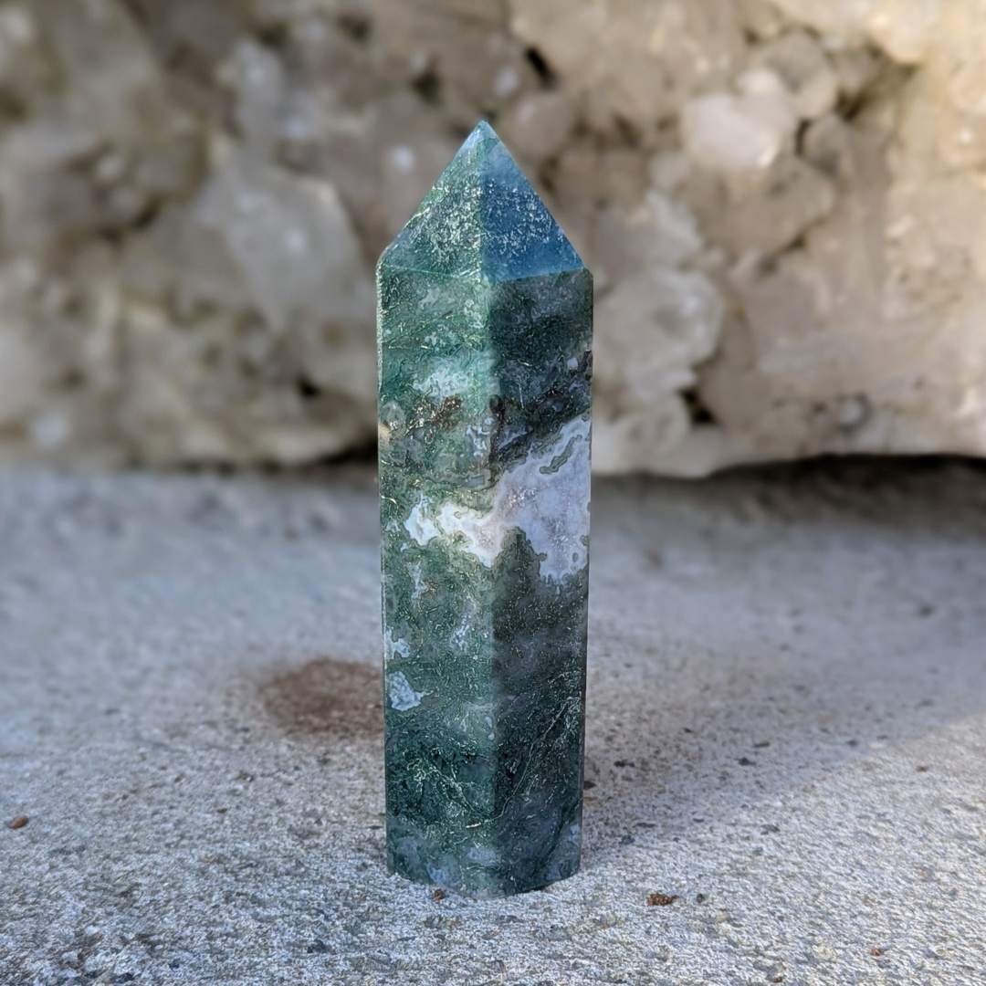 Det siges at: Mosagat healer hjertet, giver mod og hjælper dig med at få en god jordforbindelse. Mosagat er en god hjælp i alle situationer, hvor du har brug for at mobilisere al din viljestyrke, eller i perioder i dit liv, hvor du har brug for ekstra overskud – den vil fremme din vitalitet. Det er en stabiliserende sten der forbinder dig til naturen, alt liv omkring dig og minder os om at se skønheden i alt. Den arbejder på at frigøre blokeringer og mentale lænker. Mosagat er en velstands sten, der tiltrækker overflod, ikke bare økonomisk, men vil støtte alle former for frugtbar vækst og nye begyndelser. Den afbalancerer følelserne til gavn for vores kommunikation og din udtryksevne.