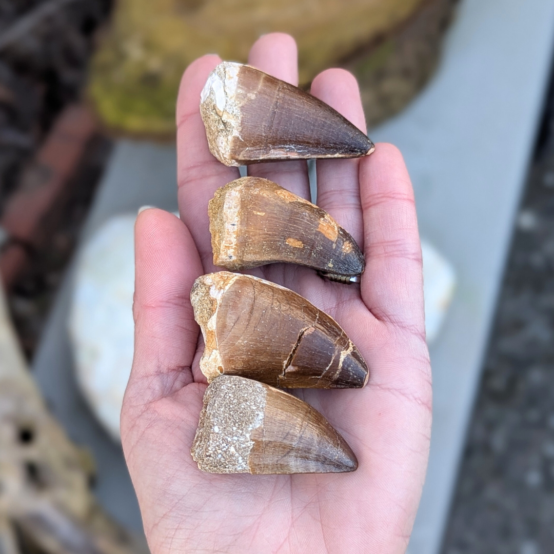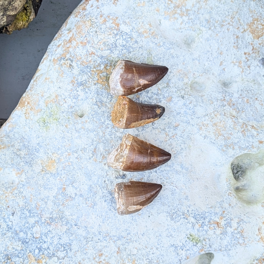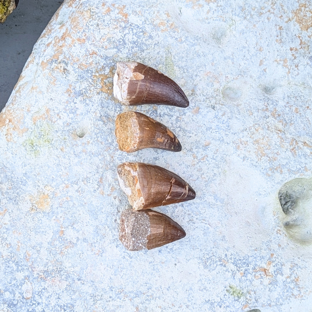 Mosasaur tænder fra Marokko. Mosasaur var et hav levende dyr som levede for ca 70millioner år siden.